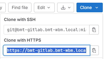 - Once created, and also from the web interface, copy the address that allows cloning of the new project via https. This is often achieved through a drop down menu on a button marked ‘Clone’, such as the below (the blue highlighted text is to be copied)