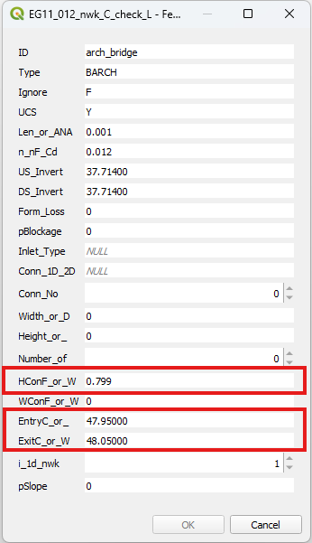 A positive HConF_or_WC value can now be used to activate the transition to orifice flow in 1D arch bridge channels (BArch type). If a positive value is specified, the HConF_or_WC is used to set the orifice flow discharge coefficient Cd. For example, setting HConF_or_WC to 0.799 (the recommended value) sets the value of Cd directly (i.e. Cd = 0.799).