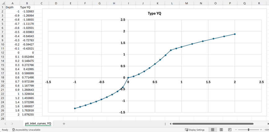 - When the water level in the 1D pit node is lower than the pit intake level or the 2D water level, the positive portion of the depth vs discharge curve is used.