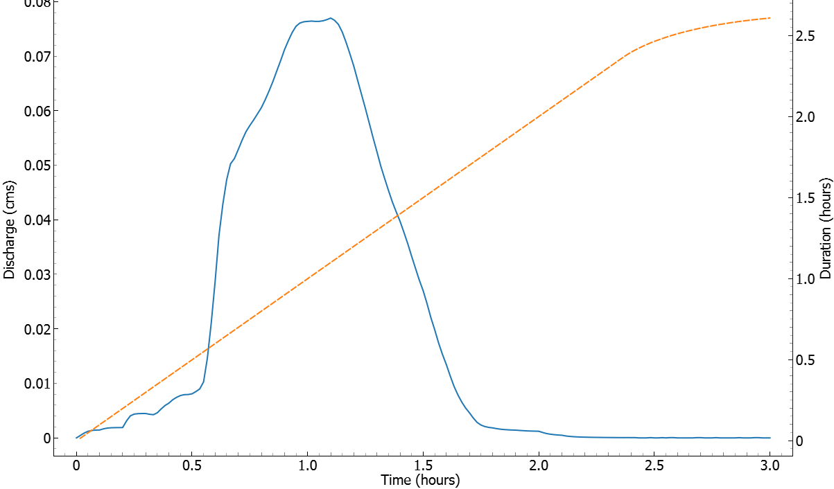 - Early in the simulation, the flow is shallow and fast moving and the automatic inlet uses on-grade calculations. This can be seen as the on-grade and automatic curves align at the start.