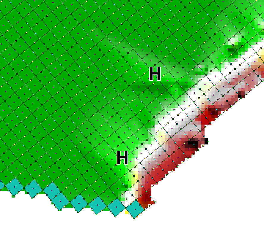 At external boundary lines where the spider web test may fail (since there are no neighbouring cells on one or more sides), TUFLOW will automatically buffer refined areas to fill gaps.