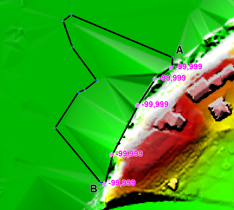 - If there are areas where data is either missing or erroneous, these can easily be corrected via interpolation using Read GIS Z Shape regions or polygons. This is achieved by digitising a polygon around the missing or erroneous data. TUFLOW interpolates elevations across the region based on the existing Zpts around the perimeter of the polygon. An example is shown in Section 7.2.6.2. Missing or erroneous data often occurs with aerial surveys where the sampling is in areas of thick vegetation, water or where post processing has poorly filtered the removal of elevated objects (e.g. buildings).