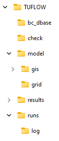 Table 2.2 presents the recommended set of sub-folders to be set up for a TUFLOW model. Any folder structure may be used; however, it is strongly recommended that a system similar to that below be adopted. For large modelling jobs with many scenarios and simulations, a more complex folder structure may be warranted, though should be based on that shown below.
