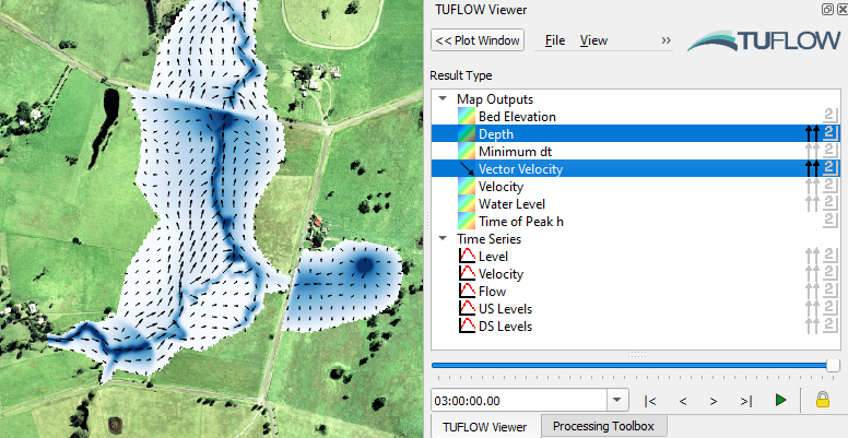 If you are using QGIS as your model development or result viewing environment, we strongly recommend installing the TUFLOW QGIS Plugin. It includes numerous tools to increase workflow efficiency and powerful result viewing functionality via its TUFLOW Viewer. After installing, the tools can be found within the TUFLOW QGIS Plugin Menu or the QGIS TUFLOW Processing Toolbox.