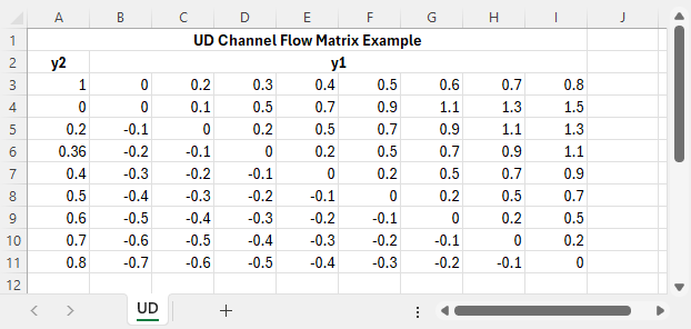 - The next rows have the downstream depth in Column A. Flows are listed in the adjacent columns relating to the above upstream depth value (Row 3).