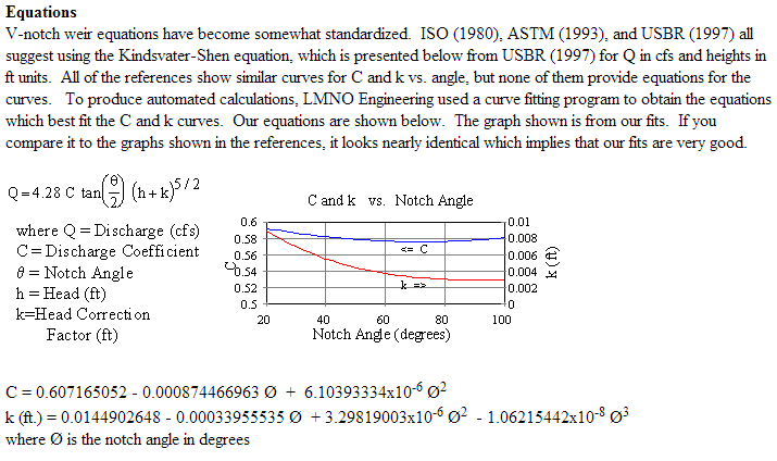 For each submergence curve, the above equations were solved to obtain values for each of the variables that produced the best fit with the curves provided in the literature. After a comparison of the results, the equation from Villemonte was chosen for several reasons: