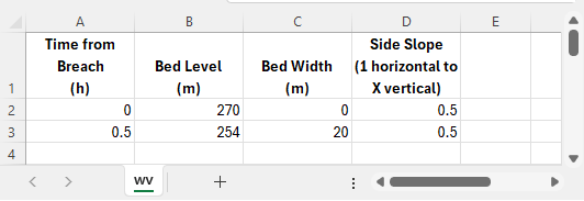 In the example below, the weir once triggered will erode from a bed level of 270m to 254m, widen from a bed width of 0 to 20m and the side slope will remain constant at 0.5. The period of time for the erosion is 0.5hours.