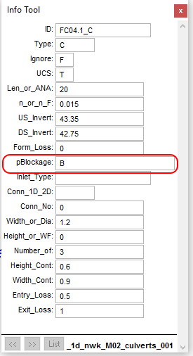 For the reduced area method, the culvert area is reduced to match the specified blockage in the same manner as varying the pBlockage attribute on the 1d_nwk layer (refer to Table 5.5). For example, with a blockage value of 10 the culvert area is reduced by 10%.