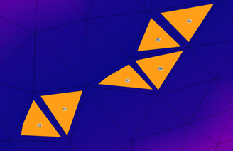 The image below presents an example from a model that will include six destratification unit structure blocks. The layer includes six polygons, each selecting one cell. The polygons are named B1, B2, B3, B4, B5 and B6.