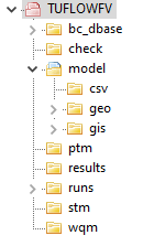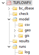 | runs | TUFLOW FV simulation control files. Batch files are also stored here when performing multiple simulations in a series. |