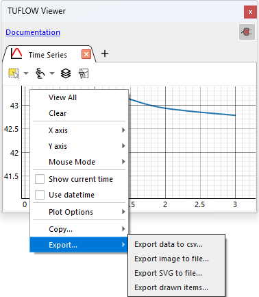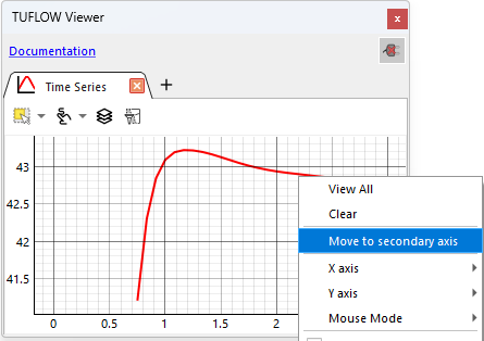 - Plot navigation: Plot navigation (pan and zoom) is always active in the new TUFLOW Viewer. Use the left mouse button (or middle mouse button) to pan the plot, use the right mouse button to scale the plot, and use the mouse wheel to zoom. For secondary axes, hold down Shift or Ctrl to pan/zoom the secondary axis. Alternatively for secondary axes, the user can interact with the axis ticks directly to pan/zoom the secondary axis (e.g. left click and drag on the axis ticks on the right-hand side to pan the secondary axis up and down).