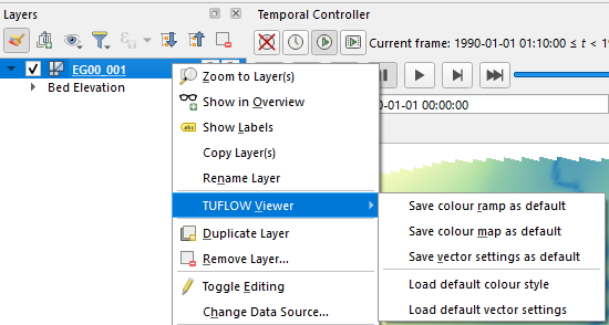 - Mesh - saving default style: In the legacy TUFLOW Viewer, it was possible to save the current style to be the default style for the given result type. This is still possible and can be found by right-clicking the mesh layer in the QGIS Layers Panel and selecting the TUFLOW Viewer submenu. The style is cached into a local folder and unlike the legacy viewer, will survive plugin updates.