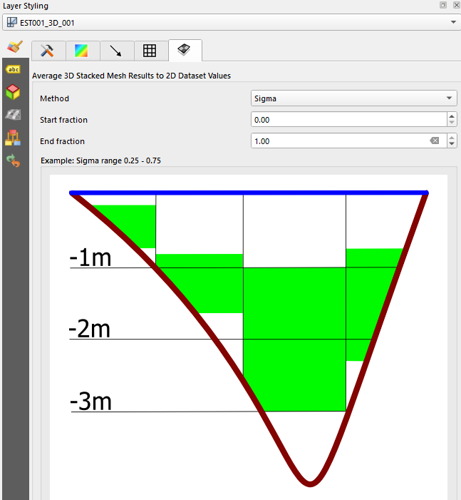 Different depth averaging methods can be used to represent the surface in the QGIS Map Canvas for 3D stacked mesh results. The method can be changed in the Layer Styling Panel. For more information on the different depth averaging methods, see the following TUFLOW FV Wiki page.