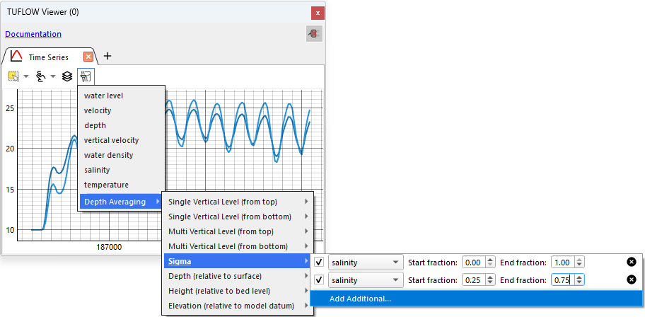The TUFLOW Viewer Plot Window also supports plotting different depth averaging methods. By default, a 3D result will use the current 3D depth averaging method used in the QGIS Map Canvas. However, specific depth averaging methods can be selected in the "Data Types" menu in the plot window for both the