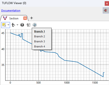 TUFLOW Viewer will pick up multiple branches, if they exist, when plotting 1D long sections. By default, the "primary" branch will be visible, and other branches will be hidden. The "primary" branch can vary depending on the result format. For TPC results, the primary branch is determined by TUFLOW and written to the plot/csv/*_1d_Chan.csv file. For results that do not have a primary branch defined in the result format, the first branch will be set as the primary branch.