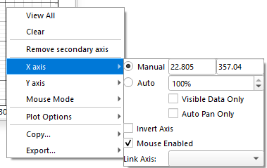 To set the axis limits or toggle the auto/manual option for the secondary axis, the secondary axis ticks should be right-clicked. Clicking in the main plot area will only show options for the main axis.